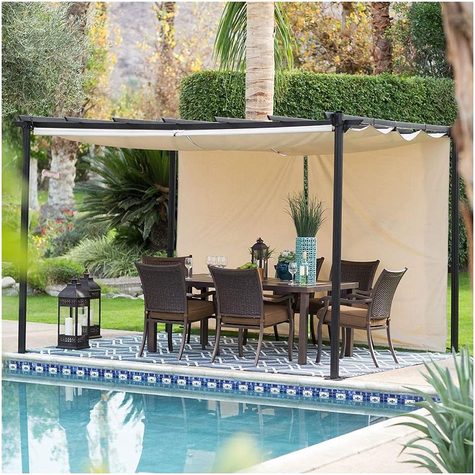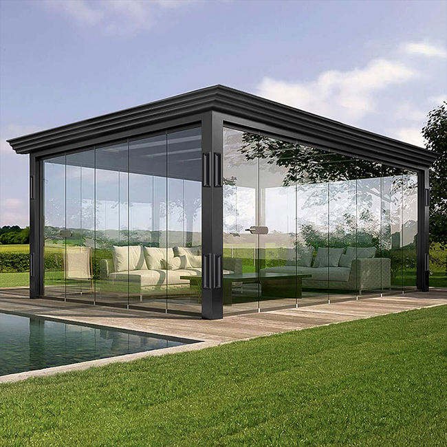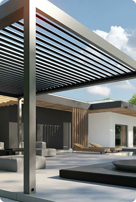Install smart pergolas with motorized roofs. Open for sun or close for shade. Remote control included for easy operation.