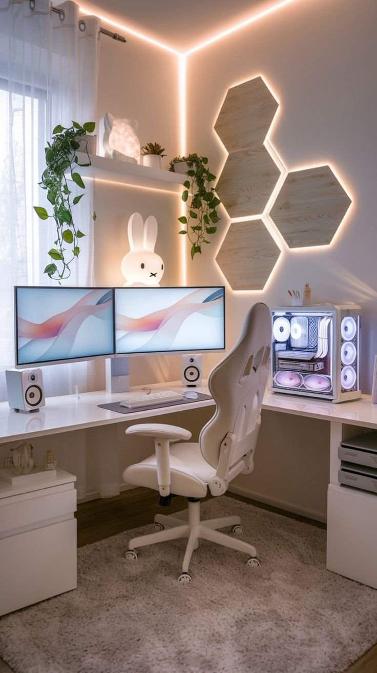 Gameing or study table with a built-in shelving unit and lighting.