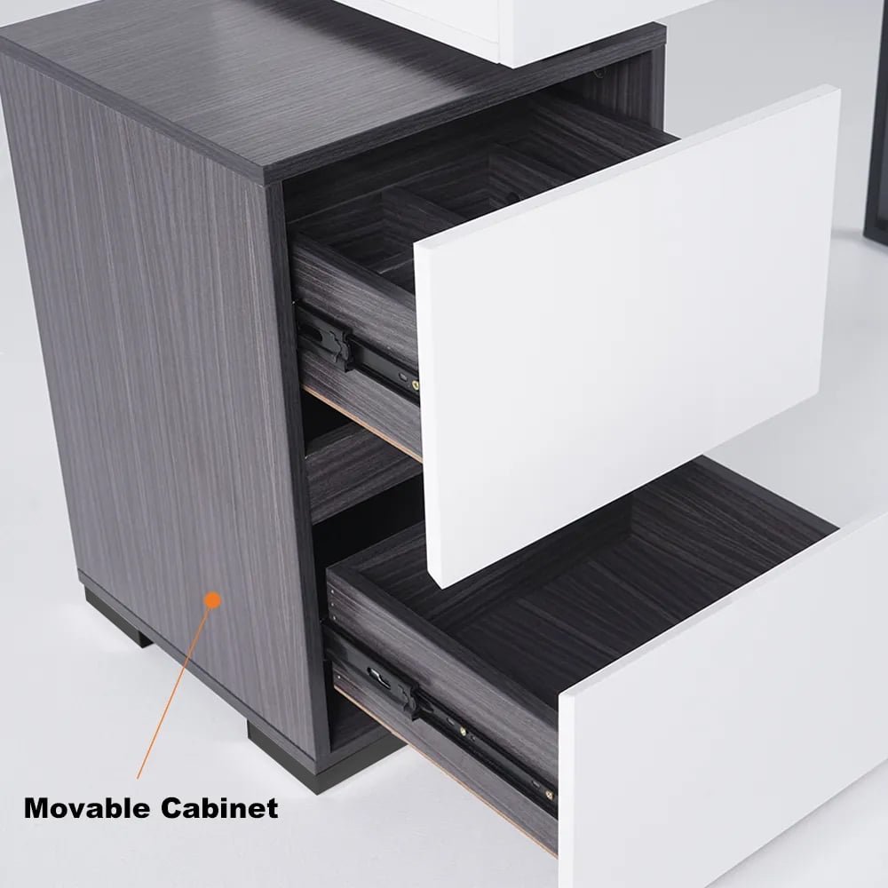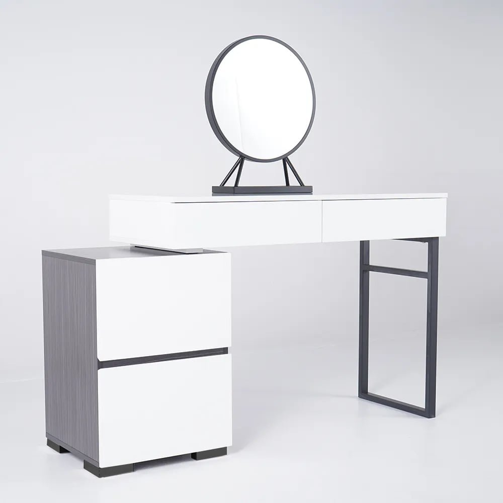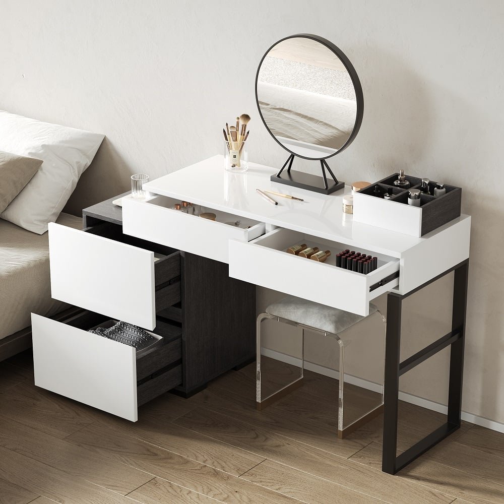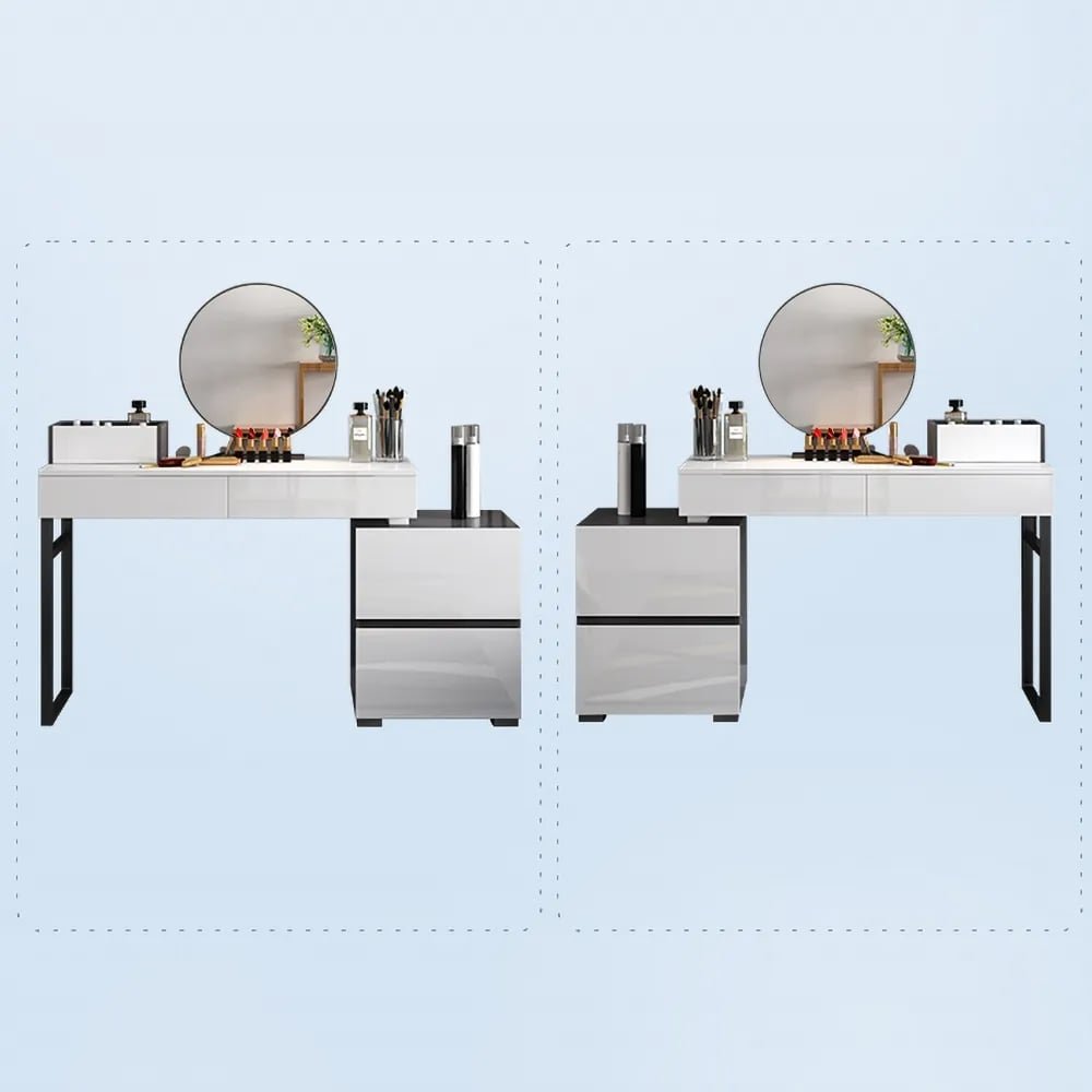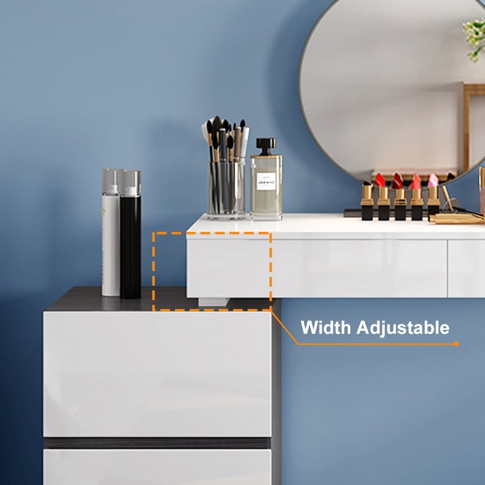 Glossy black and white extendable makeup vanity with mirror and side cabinet